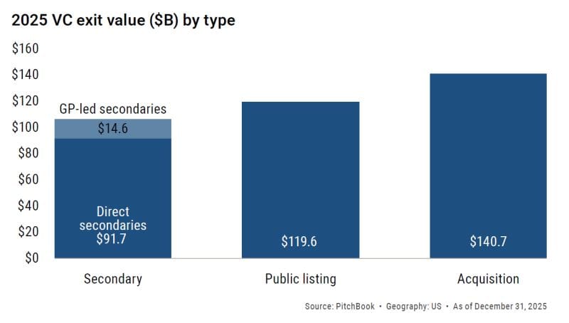 The big number: $106.3 billion. That's PitchBook's estimate for total U.S. venture secondary transaction value in 2025, combining $91.7 billion in direct secondaries with $14.6 billion in GP-led transactions. To put that in perspective, public listings generated $119.6 billion and acquisitions generated $140.7 billion in venture exit value over the same period. Secondaries are no longer a niche liquidity tool. They're approaching parity with the two traditional exit routes.