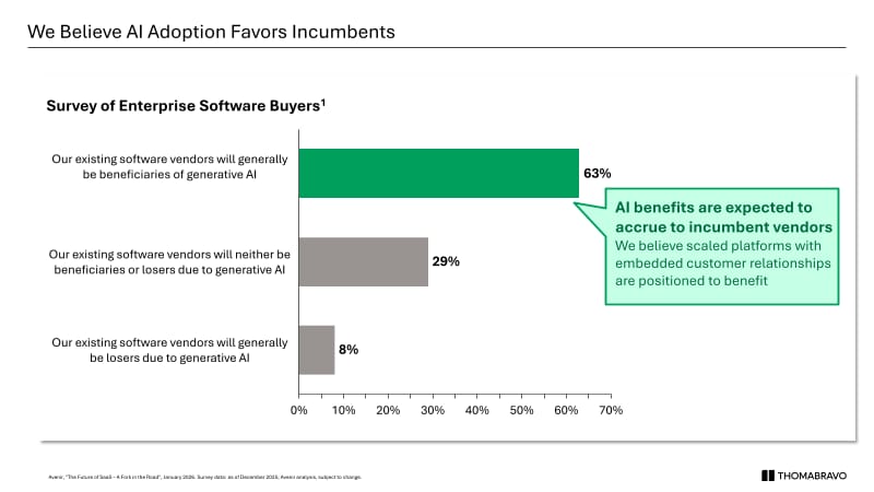 Thoma Bravo — $183 billion in assets under management, 565+ software transactions across 40 years, the largest software-focused buyout firm on the planet — held its annual LP meeting in Miami last week. Managing Partner Holden Spaht shared slides and commentary that pushed back directly on the market's blanket AI-disruption thesis.