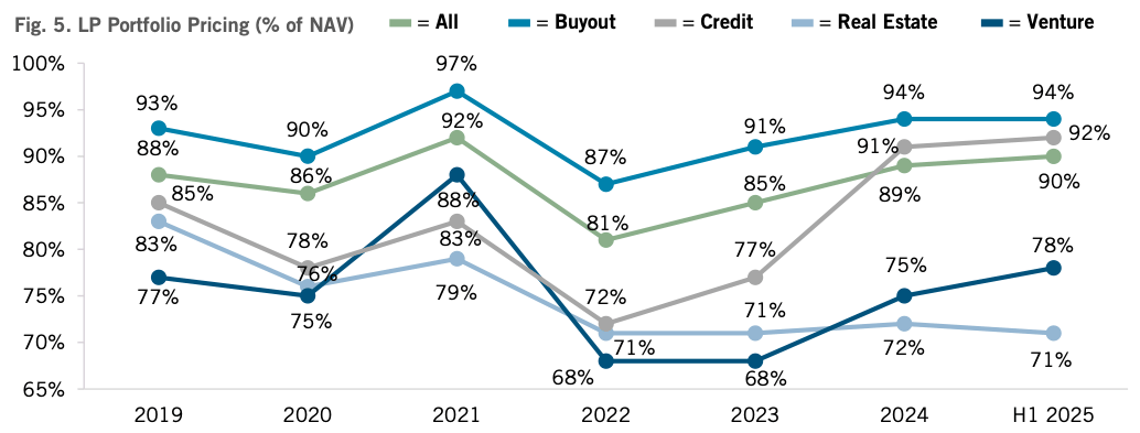 The pricing dynamics across private market secondaries reinforce why blanket assumptions about discounts are dangerous. According to the Jefferies H1 2025 Global Secondary Market Review: