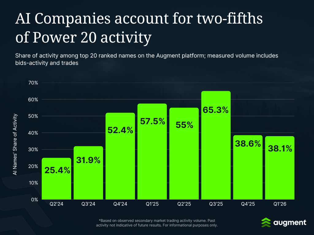 Anthropic ranked #1 for activity on the Augment platform in Q1'26, displacing SpaceX for the first time. Activity — including bids, asks, and trades — was up nearly 3x from Q4'25. Anthropic's Q1 was arguably the strongest single-quarter performance by any Power 20 name on activity growth metrics.