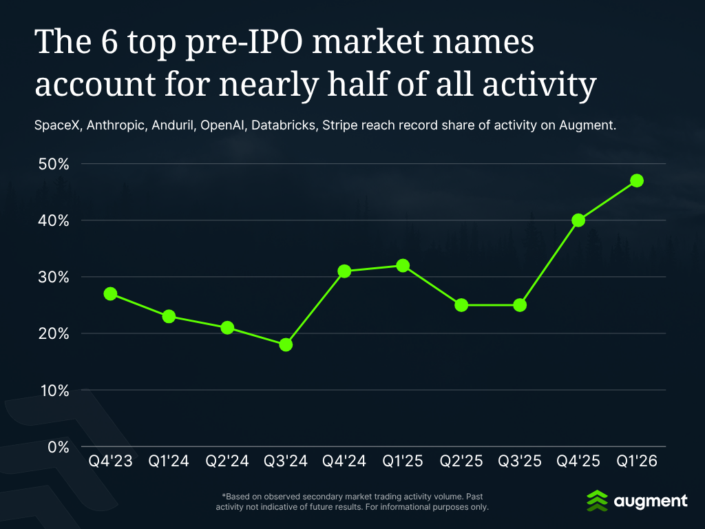 The top six-ranked names accounted for 47% of all activity across the Augment platform, up from 40% in Q4'25. We track concentration among these six because they have occupied the top of the rankings, trading a rank or two between them, for two years.