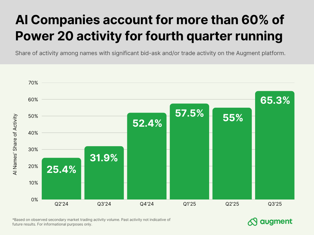 Foundation model company xAI (#7) was the most-active name on Augment in Q3’25. Up-and-coming, but still unranked, AI-centric names — including Harvey, Apptronik, and Cognition AI— are also driving interest and trades. Unranked names like Eleven Labs and Cohere also saw significant activity.